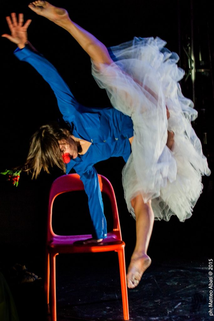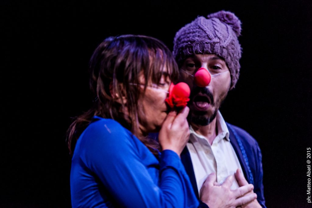 Questa è l’immagine che accoglie gli spettatori. Un fantoccio ribelle e insolente che attraverso i suoi gesti nervosi denuncia una determinata insofferenza ai fili. E’ una marionetta cosciente, pervasa da un’incredibile vitalità, incapace di stare ingabbiata, è sfrontata e grottesca e all’improvviso, indossato un tutù e un naso rosso, si libera dalle costrizioni e si trasforma in un clown danzante. Da questo momento in poi assistiamo ad una esplosione di sentimenti e sensazioni contrastanti, la marionetta prende vita, è inseguita da un palloncino, rosso come il suo naso. Un clown la guarda scettico, la insegue e la corteggia. E cerca la complicità del pubblico per smuoverla e portarla a sé.