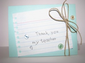 Un cartoncino, un pezzo di foglio di quaderno  con una semplice frase scritta dal bimbo, dei bottoni colorati e un fiocco di spago. Semplice ma tenero, questo biglietto piacerà certamente alla maestra.