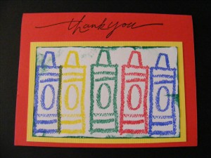 Ancora un biglietto per le maestre dell’asilo: un cartoncino con disegnati dei pastelli a cera.