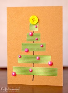 Come fare un albero di Natale? Attaccando trisce di washi tape di diversa misura. Il tronco potrà essere fatto con un altro pezzo di scotch o con il pennarello. Aggiungete bottoni o perline o strass come decorazioni. Ecco alcuni esempi.