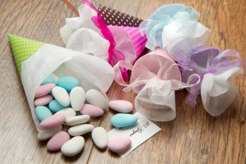 Anche in questo caso potreste acquistare stock di sacchettini in organza che hanno un costo veramente basso e abbellirli con qualcosa realizzato da voi in aggiunta. Oppure, se siete minimamente brave a usare la macchina da cucire, acquistare della stoffa e creare dei sacchettini. Sistemate i confetti nel tulle e infilate il tutto nei sacchettini che chiuderete con un nastrino in tinta.
