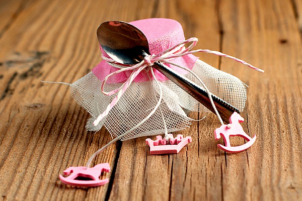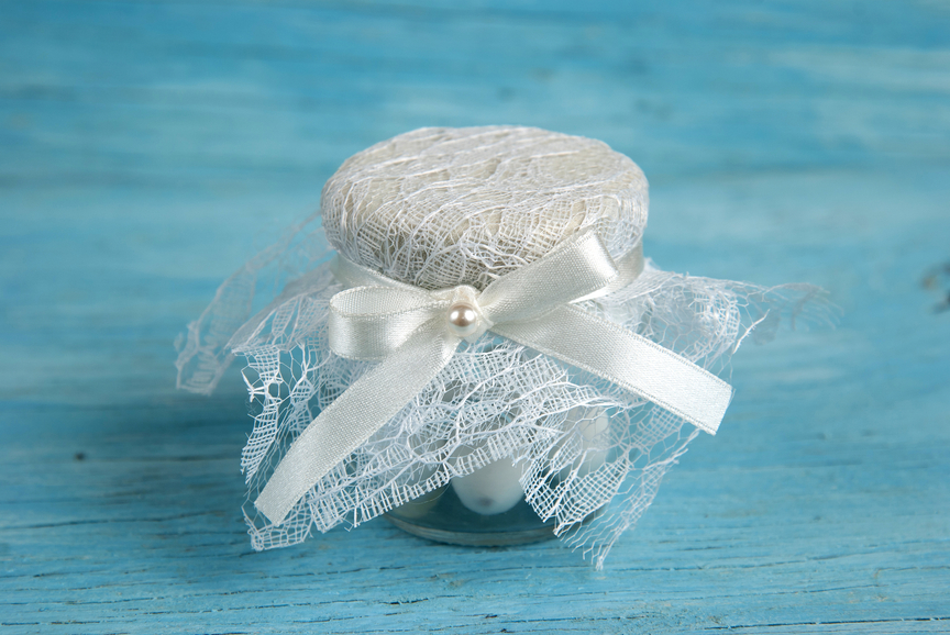 I vasetti di vetro possono essere utilizzati come contenitori di confetti o caramelle colorate. Si trovano a poco prezzo in diversi negozi per la casa oppure, partendo per tempo, potete tenere tutti i vasetti di omogeneizzati, budini, yogurt che utilizzate e riciclarli, dopo averli ben lavati. L’ideale è che abbiano il coperchio che andrà decorato con stoffa, rafia, nastri, fiorellini di carta, piccoli pompom.
