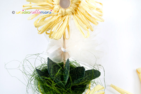 Realizzare adesso un grosso fiocco intorno al vaso utilizzando i fili di rafia. Fissare al vaso con un goccio di colla a caldo.