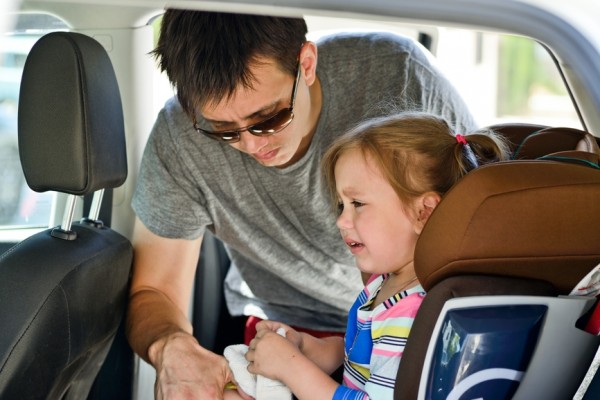 bambina che viene legata al seggiolino e piange
