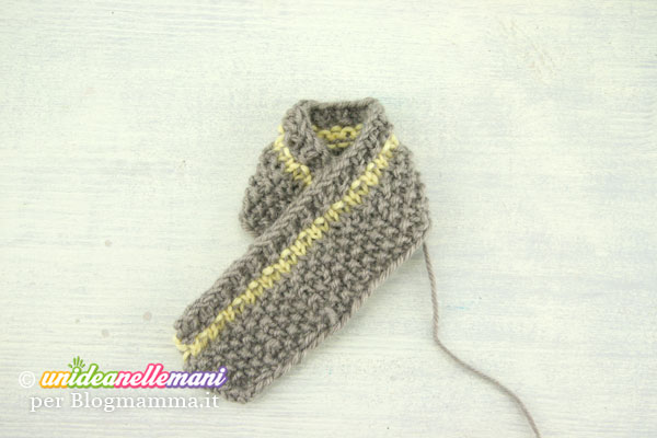 Potrai farle in tinta unita o anche di più colori, lavorarle a grana di riso come ho fatto io o con altri punti a maglia. L’importante è che tu non esageri con la lunghezza del rettangolo che indicativamente dovrebbe essere tre volte la misura del piedino. Un lavoro a maglia di lana infatti risulta abbastanza elastico e le babbucce devono rimanere aderenti.