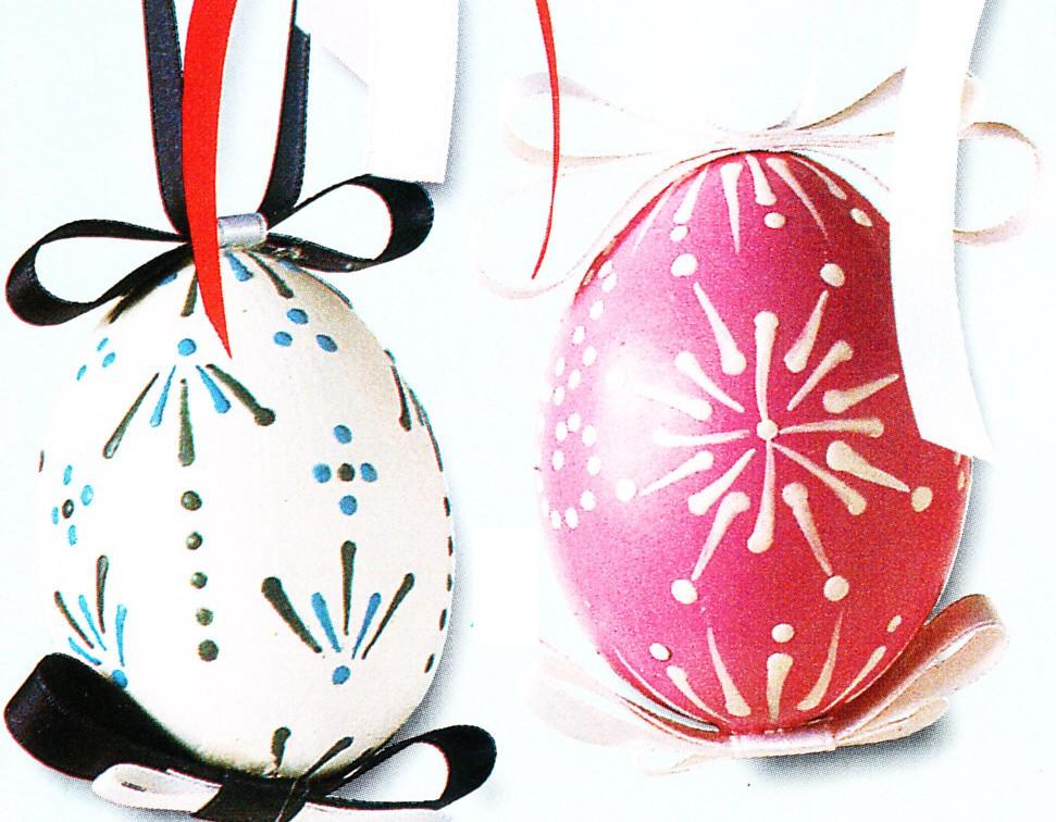 Per svuotare le uova, lavarle, forarle ai due poli, picchiettando leggermente. Soffiando in uno dei due fori, far uscire il contenuto dall’altro. Colorare i gusci con lo smalto. Procedere alla decorazione a cera, preparando un colore per volta. Far sciogliere in un pentolino un pezzo di candela e uno di pastello colorato, mescolare bene, versare nel contenitore vuoto di una candela per scaldavivande e tenere in caldo su un’altra candela scaldavivande. Infilare uno spillo su una matita o un bastoncino, intingere la capocchia nella cera e disegnare a mano libera sul guscio i motivi che vedete nell’immagine o come al solito tutto ciò che preferite! Procedere allo stesso modo con gli altri colori. Annodare i nastrini a coccardina e incollarle ai vertici dell’uovo con la colla a caldo.