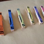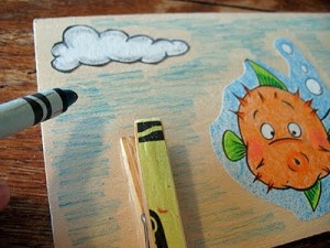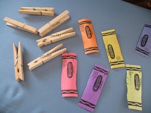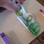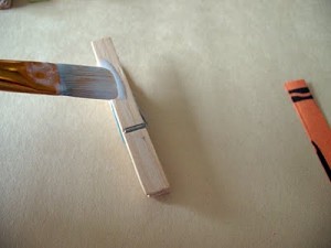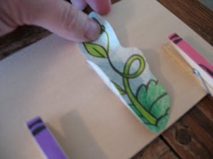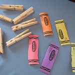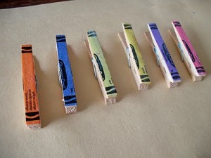 Nel tutorial originale l’autrice ha pensato di decorare le mollette di legno incollando la cartina colorata dei pastelli a cera. Se volete fare altrettanto, tagliate con un taglierino la cartina che avvolge i pastelli, prendete la misura di ciò che vi serve per ricoprire un lato della molletta, ricavate ciò che è necessario,  e, dopo aver spalmato un lato delle mollette con la colla diluita con l’acqua, incollate la carta.