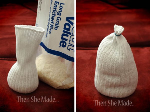 • Riempite questo “sacchetto” di calza con del riso. Potreste anche utilizzare sale grosso, lenticchie, fagioli, semi di lino, se volete che il pupazzo rimanga in piedi. Se preferite l’idea di qualcosa di morbido, riempitelo con della bambagia. (tutorial qui )