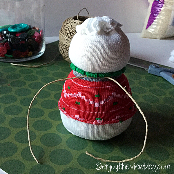 • Passate uno spago intorno ai due bordi (o anche solo al primo, in alto) della calza fantasia e stringete. Avrete ottenuto la forma del pupazzo a due o tre palle di neve. (tutorial qui)