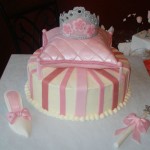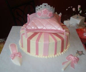 Per tanti invitati, due dischi di pan di spagna ricoperti di pasta di zucchero rosa e una bella corona in cima. Potreste inserire nella corona il numero degli anni compiuti.
