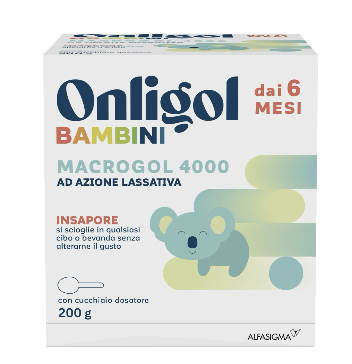 Onligol Bambini è indicato dai 6 mesi in su, ha un’azione delicata e contiene Macrogol 4000. è senza zuccheri, lattosio o glutine, e ha un pratico cucchiaio dosatore per facilitare la somministrazione.