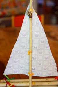 E’ giunto il momento della vela, ritagliate da un pezzo di tela un triangolo, incollatela ad pezzo di bambù,  fermandola con un paio di punti.
