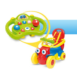 si tratta di un cavalcabile parlante versatile e divertente. Il volante è staccabile e contiene tante melodie e frasi divertenti che accompagneranno il bambino alla scoperta dei numeri, delle lettere e anche del primo inglese. Dotato di un pratico maniglione posteriore per consentire un controllo costante dei genitori. Target: 10 mesi-3 anni.