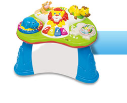 un tavolo tutto elettronico con 5 simpatici personaggi dello Zoo che in modo divertente faranno scoprire al bambino i primi numeri, la musica e anche l’inglese. Le gambe sono staccabili e il tavolo diventa un pannello attività da portare ovunque. Target: da 12 mesi.