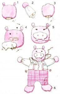 testa e naso, cucire i bottoni degli occhi sulla testa e quelli delle narici sul naso. Con la colla attaccare il naso sulla testa (disegno 4). Con il pennarello nero disegnare le ciglia e con quello rosa la bocca (disegno 5);