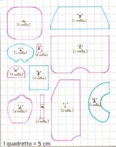 Ricavare a grandezza naturale i diversi pezzi che compongono il modello, tenendo presente che ogni quadretto dello schema corrisponde a cm 5. Appoggiare le sagome sui vari tessuti e tagliarle, come indicato di seguito, lasciando qualche millimetro in più per le cuciture, tranne il collo e la gommapiuma che vanno tagliati a filo:
