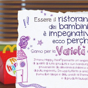 “Da papà sento una responsabilità: far crescere i nostri bambini con il senso dell’equilibrio”, conclude Marco Ferrero, direttore marketing McDonald’s Italia. “Equilibrio tra il tempo che dedicano alle attività scolastiche (a volte troppo!) e il gioco. Equilibrio tra giochi elettronici e giochi in movimento… Lo stesso vale per l’alimentazione. Io sono genovese eppure dico che se mio figlio mangiasse tutti i giorni solo focaccia non crescerebbe sano. Così, se un bambino mangiasse tutti i giorni Happy Meal ne avrebbe delle conseguenze: non perché l’Happy Meal non sia sano ma perché qualunque eccesso non è sano. Noi siamo assolutamente sereni nella consapevolezza di proporre un cibo buono ed equilibrato. E siamo anche confortati da stime secondo le quali la frequenza di acquisto da parte delle famiglie italiane è di 2 Happy Meal al mese. Non è certo questo che rende obesi i bambini, sono piuttosto stili di vita scorretti e sedentari. Per questo McDonald’s vuole promuovere un modo sano e divertente di avvicinarsi allo sport, anche in occasione delle prossime Olimpiadi”.