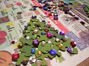 Vi sarà certamente capitato di avere un puzzle del quale non trovate più qualche pezzo o che i vostri bimbi non fanno più perchè troppo da piccoli. Riutilizzate i pezzi dipingendoli di verde. Una volta asciugati, passate i pezzi con il vinavil e attaccateli uno all’altro in modo che possano formare un alberello. Attaccate delle paillettes colorate o delle palline di carta e l’albero è pronto. Incollatelo ad un cartoncino verde e potrete appenderlo all’albero.