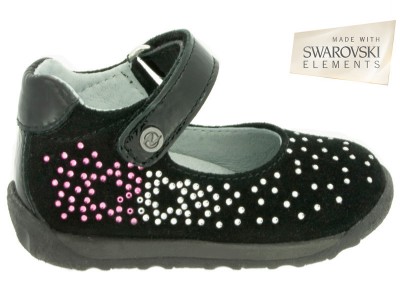 Un esempio? Una bebè in velour nero con inserti in vernice e Swarovski sulla tomaia che disegnano due stelline. Perfetta per i primi passi sotto l’albero di Natale.