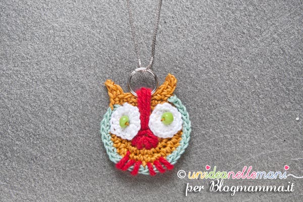 A questo punto prendi due anellini per orecchini, passali dentro ai punti che hai fatto sulla fronte del gufo e poi infilaci dentro la monachella.