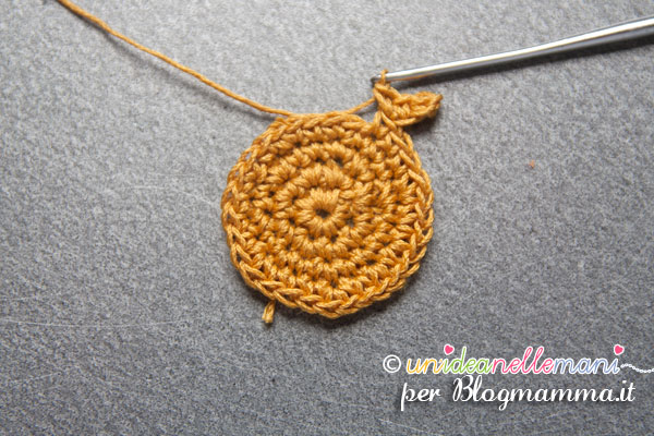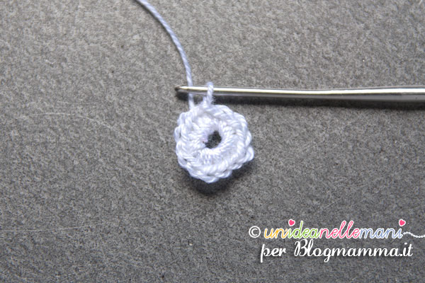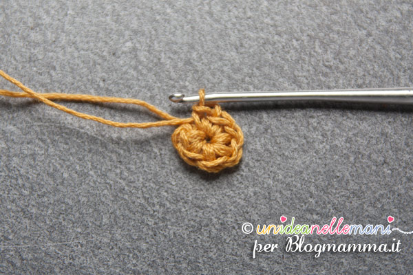 1 giro: lavora un anello magico con dentro 8 maglie basse. Chiudi l’anello.