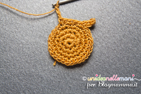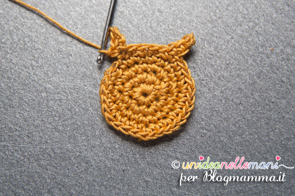 5° giro: per fare l’orecchio destro del gufo,  lavora 4 catenelle. Torna indietro lavorando 3 maglie basse sulle catenelle che hai appena fatto.