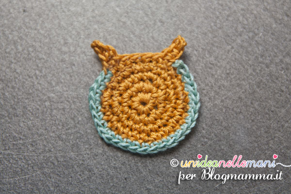 chiusura 5° giro: a questo punto per terminare il giro, cambia colore e lavora a maglia bassa fino ad arrivare all’orecchio destro. Chiudi e taglia il filo.