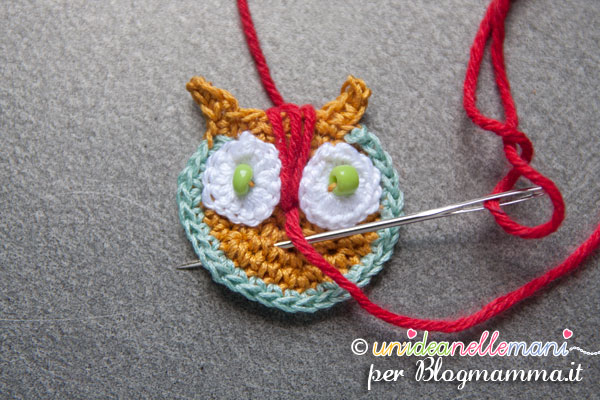 Con una gugliata di filo rosso (o del colore che vuoi), cuci tre punti lunghi sulla fronte del gufo, altri tre o quattro per il becco e sei per le zampette.