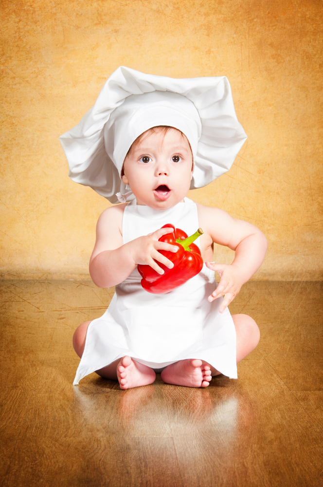 Healthy food. Surprised little chef with red pepper in hand. Healthy food. Surprised little chef with red pepper in hand.