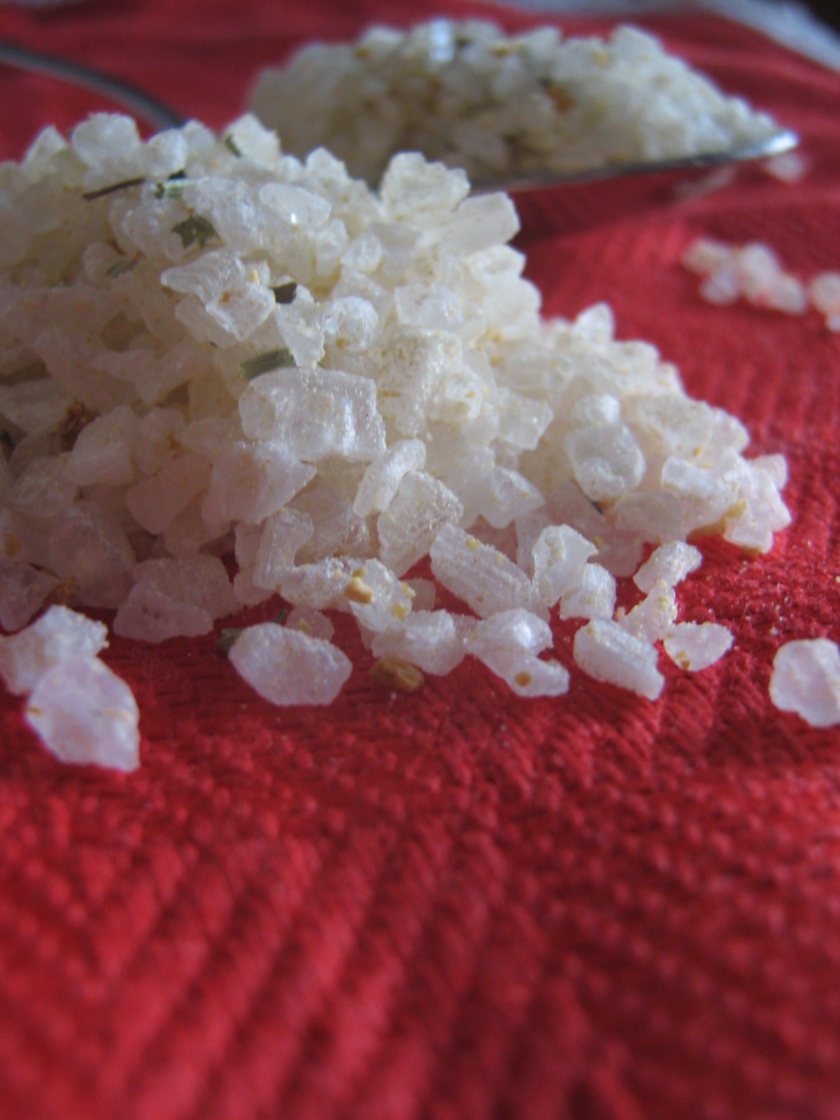 Potrete regalare la polvere alle vostre amiche oppure utilizzarla per aromatizzare il sale, come ho fatto io. Ho comprato al supermercato un sale grosso un po’ pregiato (sale di Trapani), ho aggiunto la polvere d’arancia e le erbe provenzali (che avevo comprato ad una fiera, ma che trovate anche nella grande distribuzione).