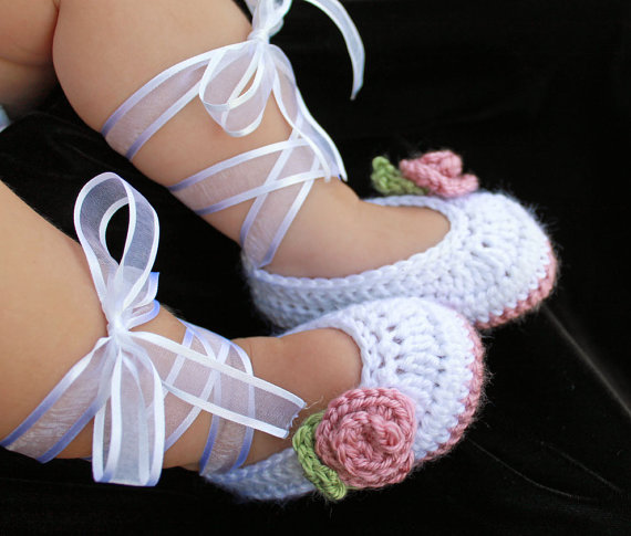 Romantiche ballerine all’uncinetto. Io personalmente non amo molto i nastri, ma per il resto sono l’ideale anche per un abito da battesimo.