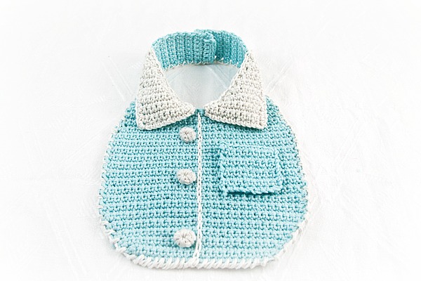 Infine lavora un piccolo quadrato di 9 maglie basse per 9 giri. Cuci questo piccolo taschino al bavaglino