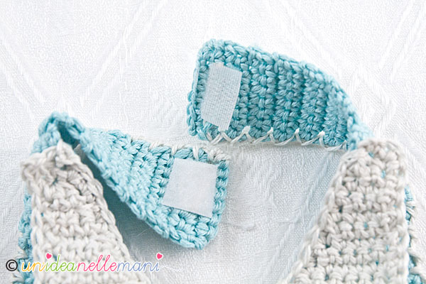 Per la chiusura del bavaglino attaccare alla fine delle “bretelline” un piccolo pezzettino di adesivo a strappo (velcro).