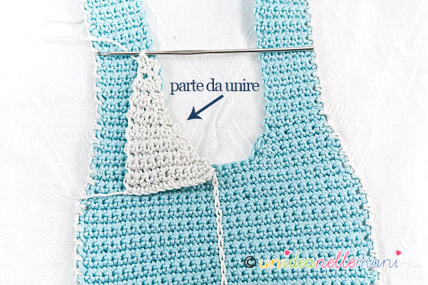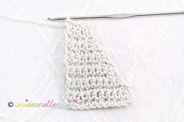 Lavorare 2 triangoli che hanno alla base 10 maglie basse e nella punta 2 maglie basse. Lavorare 1 diminuzione di maglia un giro si e uno no.