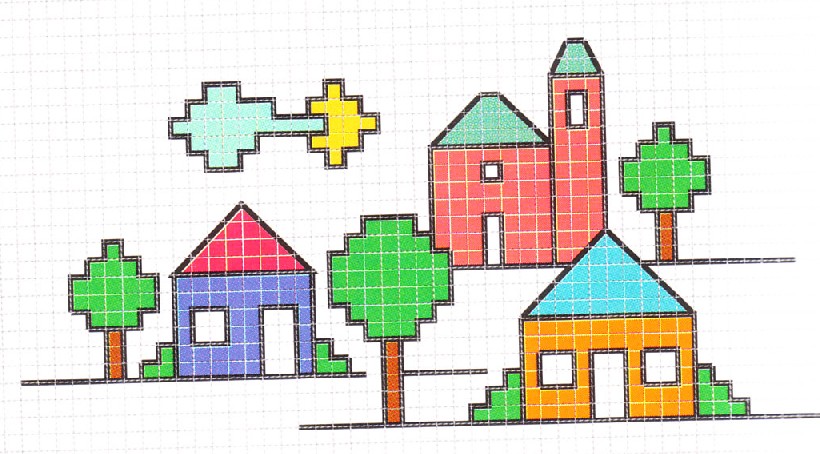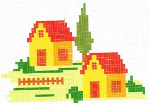 Anche queste casette, ripetute più volte alla stessa distanza una dall’altra, potranno abbellire le lenzuola e le federe del lettino