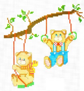 E invece cosa ne dite di questi due orsetti mattacchioni che potete tranquillamente ricamare sulle tende in lino della camera del piccolo o sul sacco porta giochi