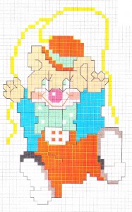 Cominciamo con questo simpaticissimo orsetto clown che potete utilizzate per realizzate il decoro per un porta pigiama, oppure su una federina o ripetere in sequenza sul bordo di un lenzuolino 🙂