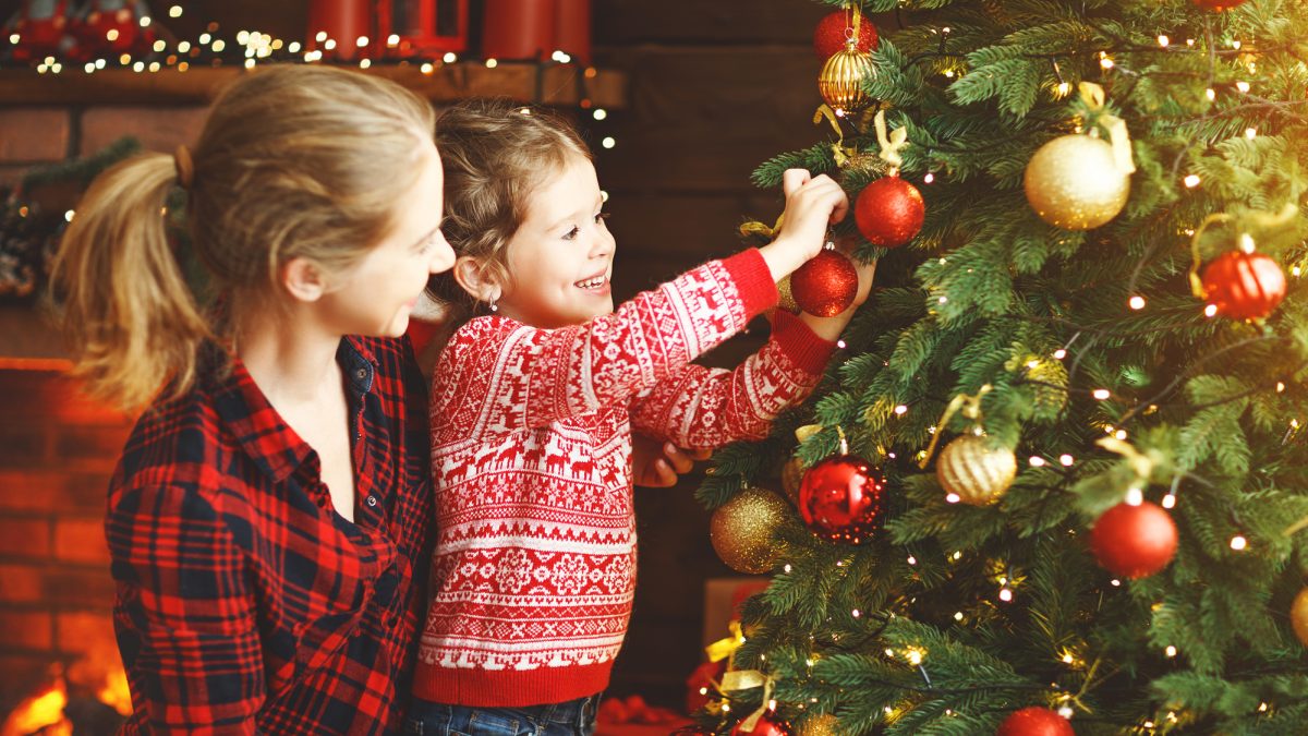 happy family mother and child girl decorated Christmas tree happy family mother and child girl decorated a Christmas tree