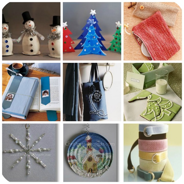 Da sinistra a destra: pupazzo di neve segnaposto | albero di cartone segnaposto | pochette realizzata a maglia o all’uncinetto  | segnalibro in pelle  | shopper in jeans | un puzzle biscotto | siete bravissime nel creare bijoux per le amiche? Ecco qualcosa che fa per voi, un fiocco di neve con perline | coperchi di latta  con decoupage |  una cintura in velluto