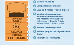 Il seggiolino regolare, ovvero conforme alla normativa europea, deve riportare un’etichetta con gli estremi dell’omologazione. I dispositivi più recenti sono contrassegnati dalla sigla ECE R44-03. Per legge, sono gli unici che possono essere venduti nei negozi. Se già in possesso, possono essere usati anche dispositivi precedenti, contrassegnati dalle sigle ECE R44 o EC R44-02.